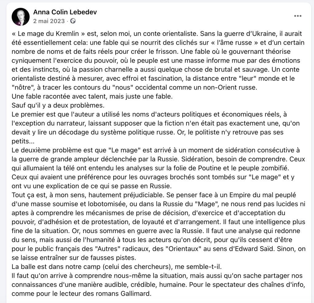 J’avais pu reprocher à Giuliano da Empoli d’entretenir dans son livre l’ambiguïté entre réalité et fiction, et de laisser penser aux lecteurs que ce roman était en fait une analyse de l’exercice du pouvoir en Russie. Lu comme un récit sur le pouvoir, c’est une magnifique fable orientaliste. Lu comme une réflexion sur la Russie, c’est un livre qui déforme et désinforme.