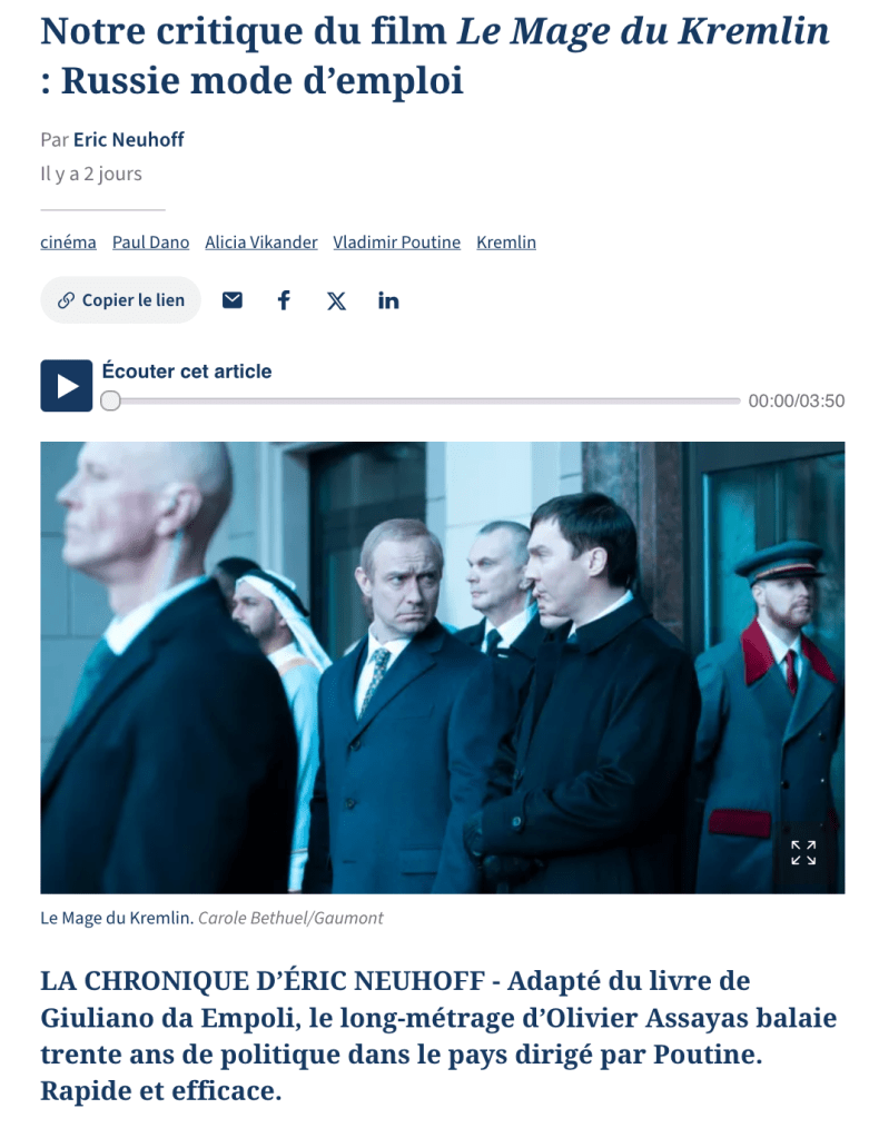 J’ai posté ce commentaire hier sur les réseaux sociaux, en sortant de la projection du film d’Olivier Assayas, adapté du roman éponyme de Giuliano da Empoli. Je me dois d’expliquer.